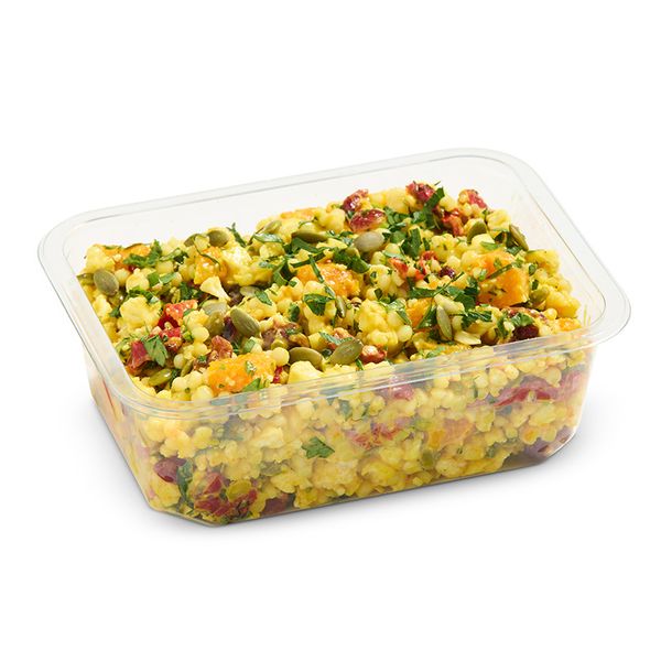 -IMPROVED RECIPE- Pearl couscous and diced cauliflower tossed with roasted red capsicum, pumpkin, pepitas, cranberries and parsley in a turmeric tahini dressing